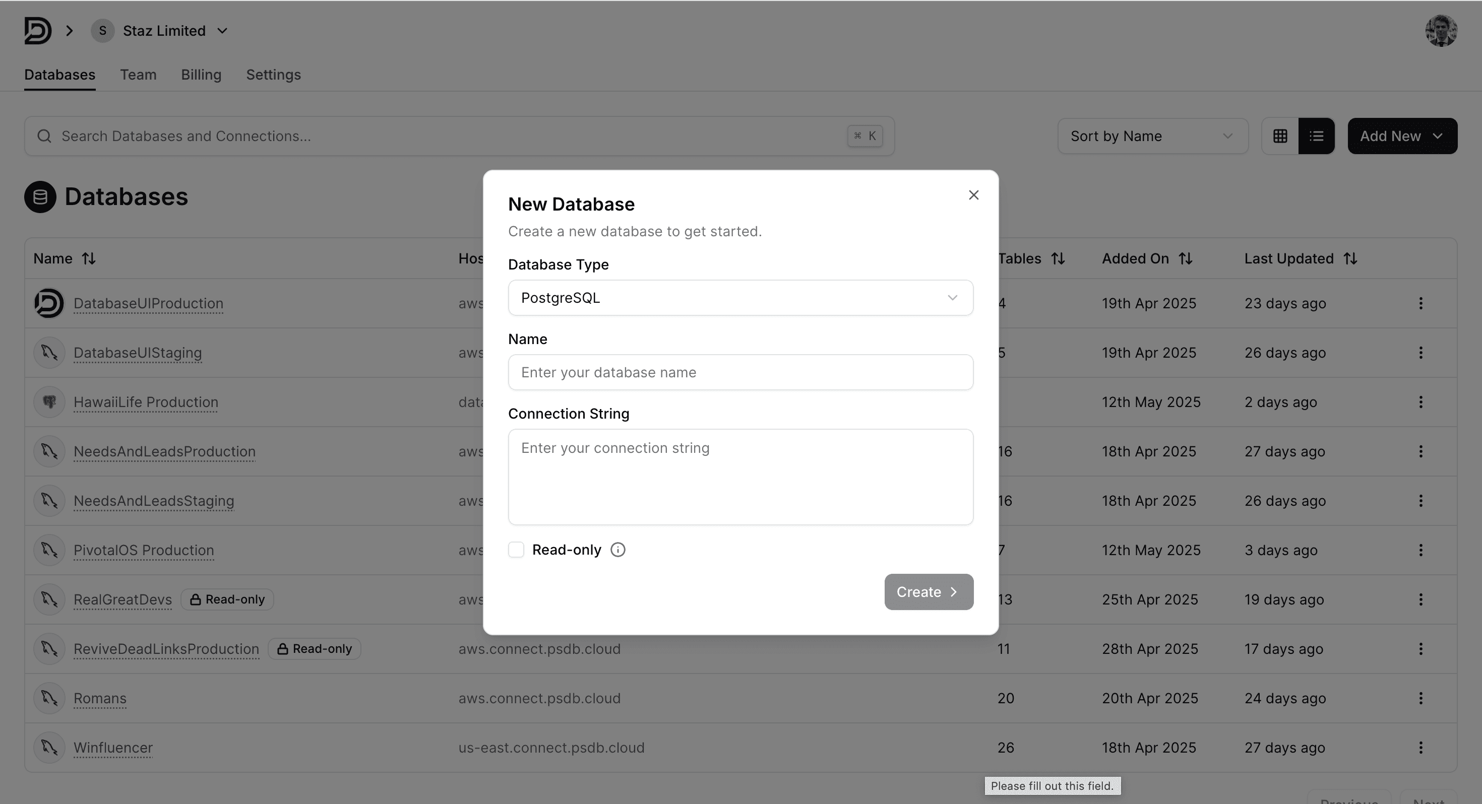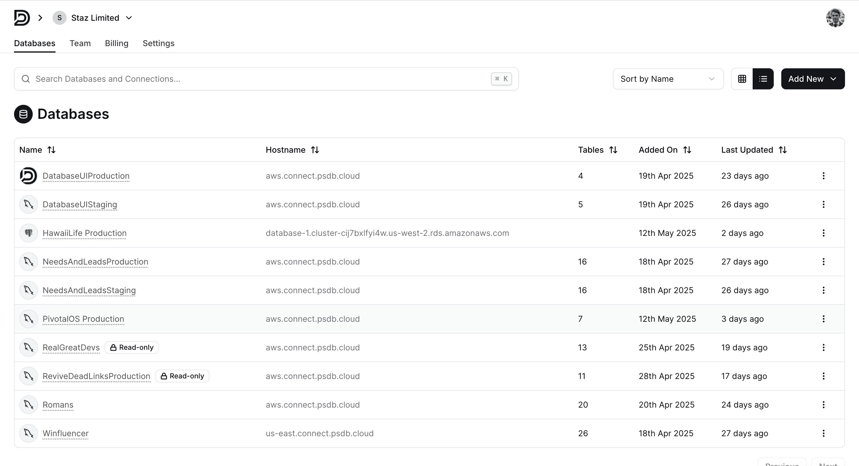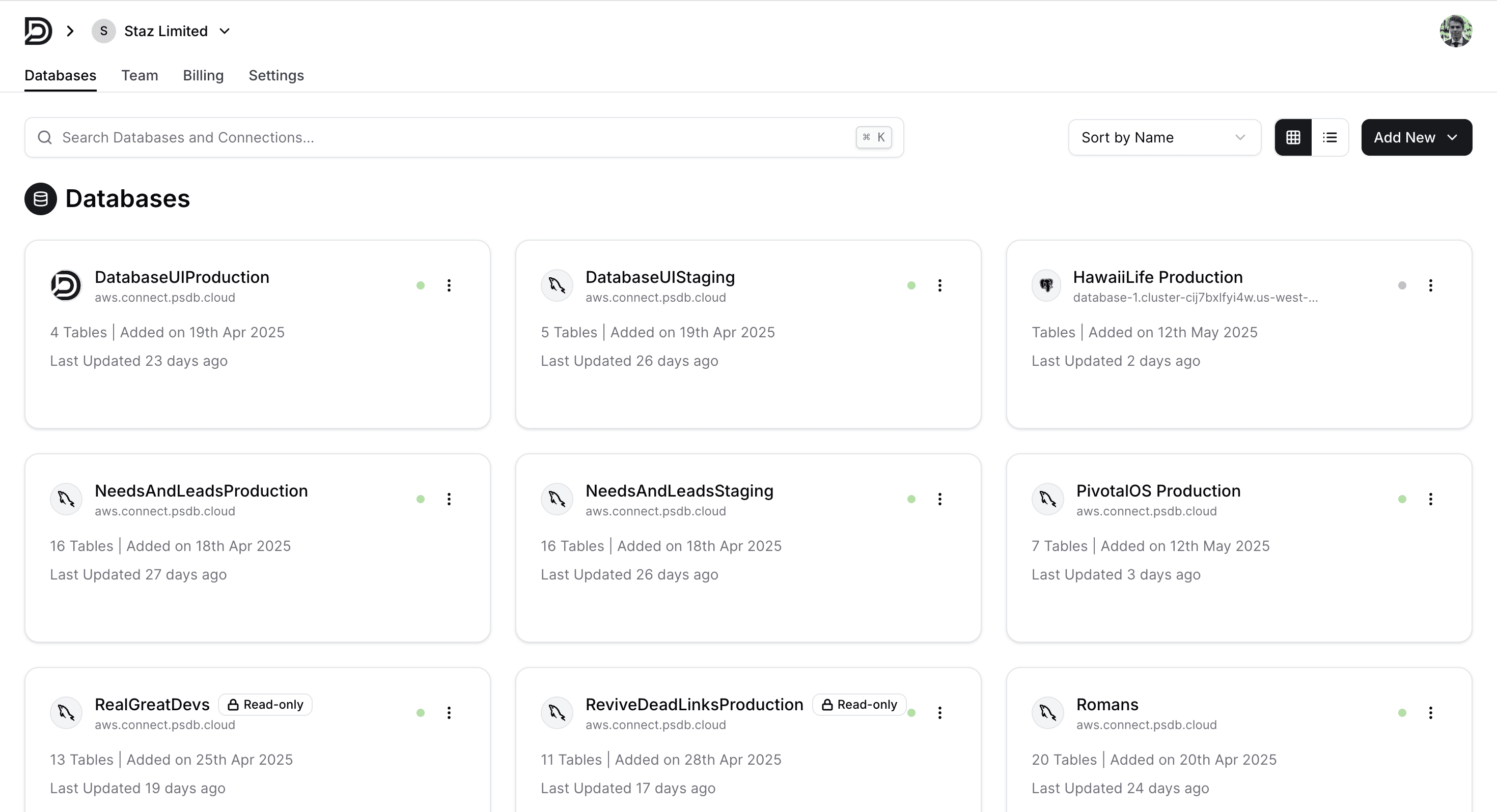 Database Connection Management: Users can connect and manage multiple databases, each shown in a tidy list with metadata, status indicators, and quick actions.