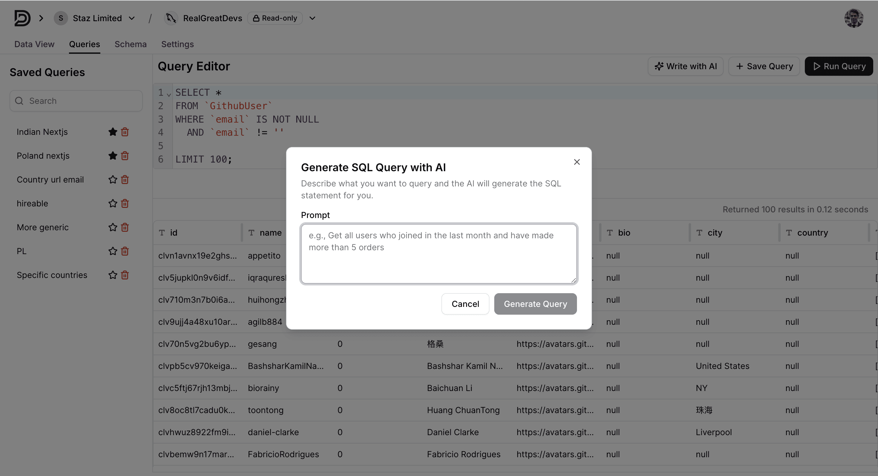 Context-Aware Generative AI: Integrated a powerful AI assistant that understands your schema and lets users describe what they want in natural language. The assistant generates complex SQL queries instantly – accelerating productivity and reducing cognitive load.