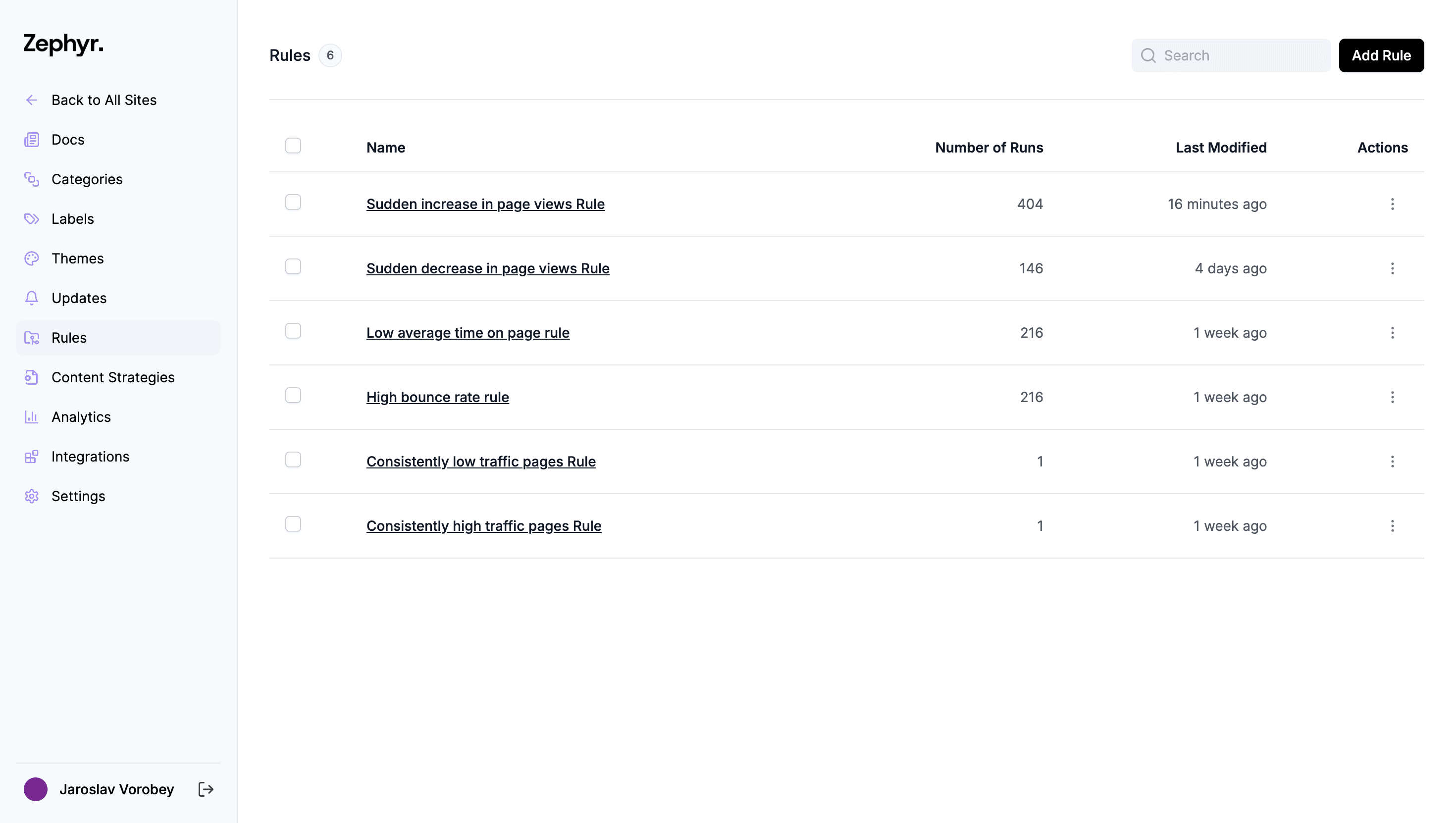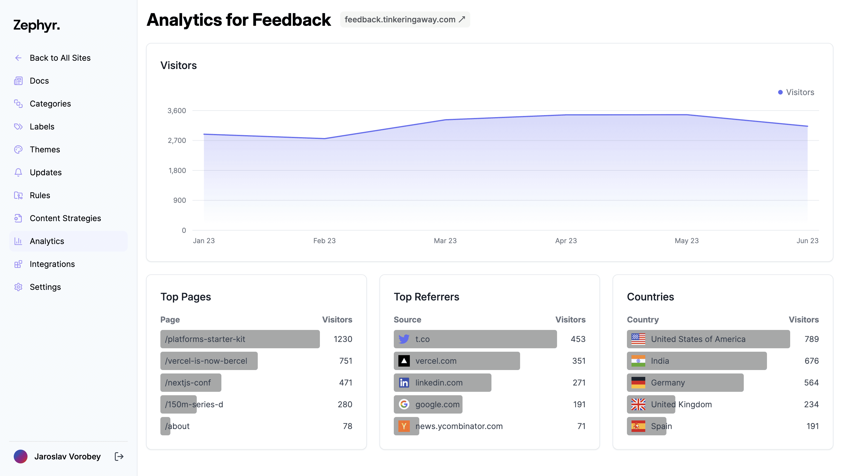 Custom tracking for user sessions, page views, view duration, and scroll depth.